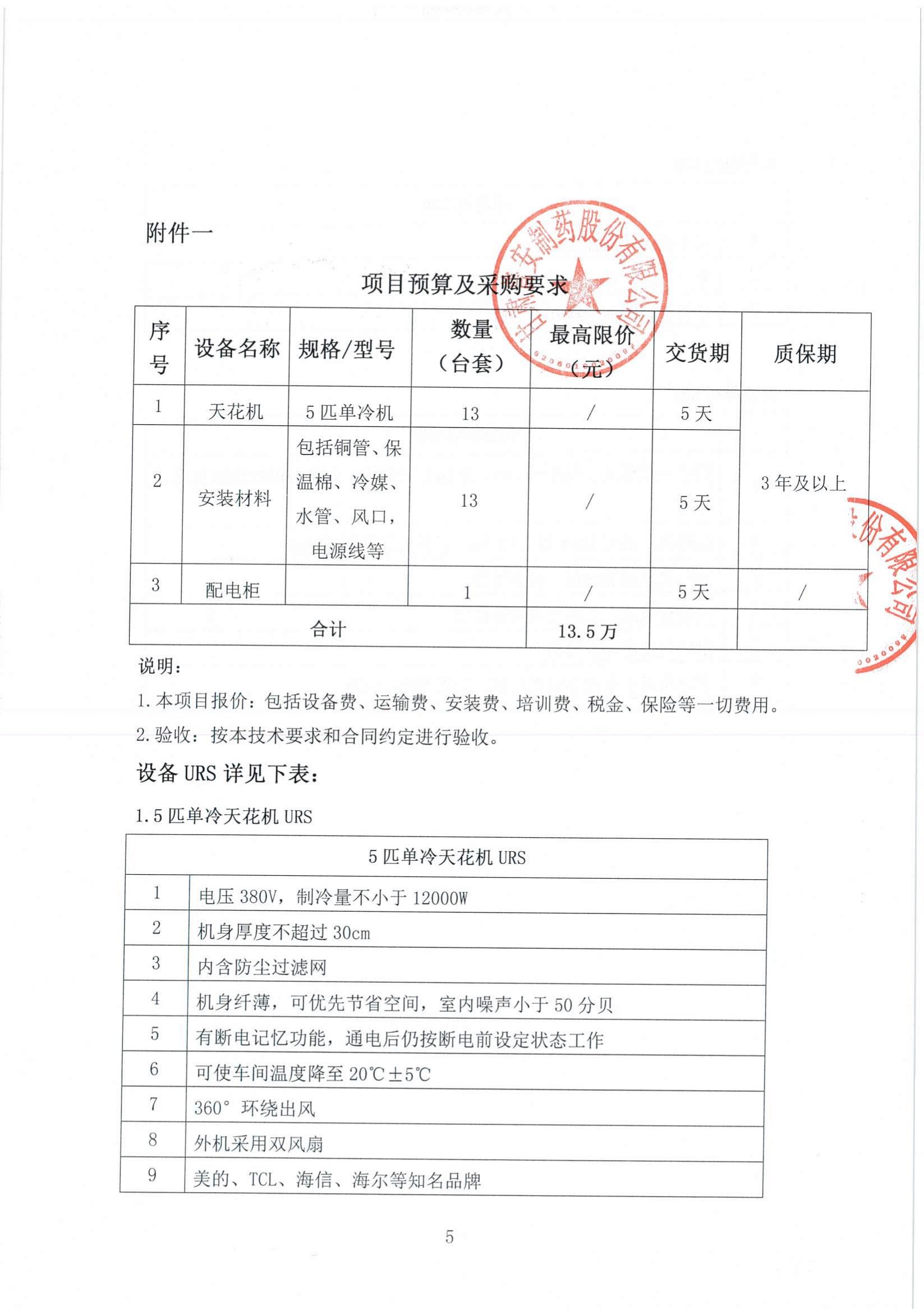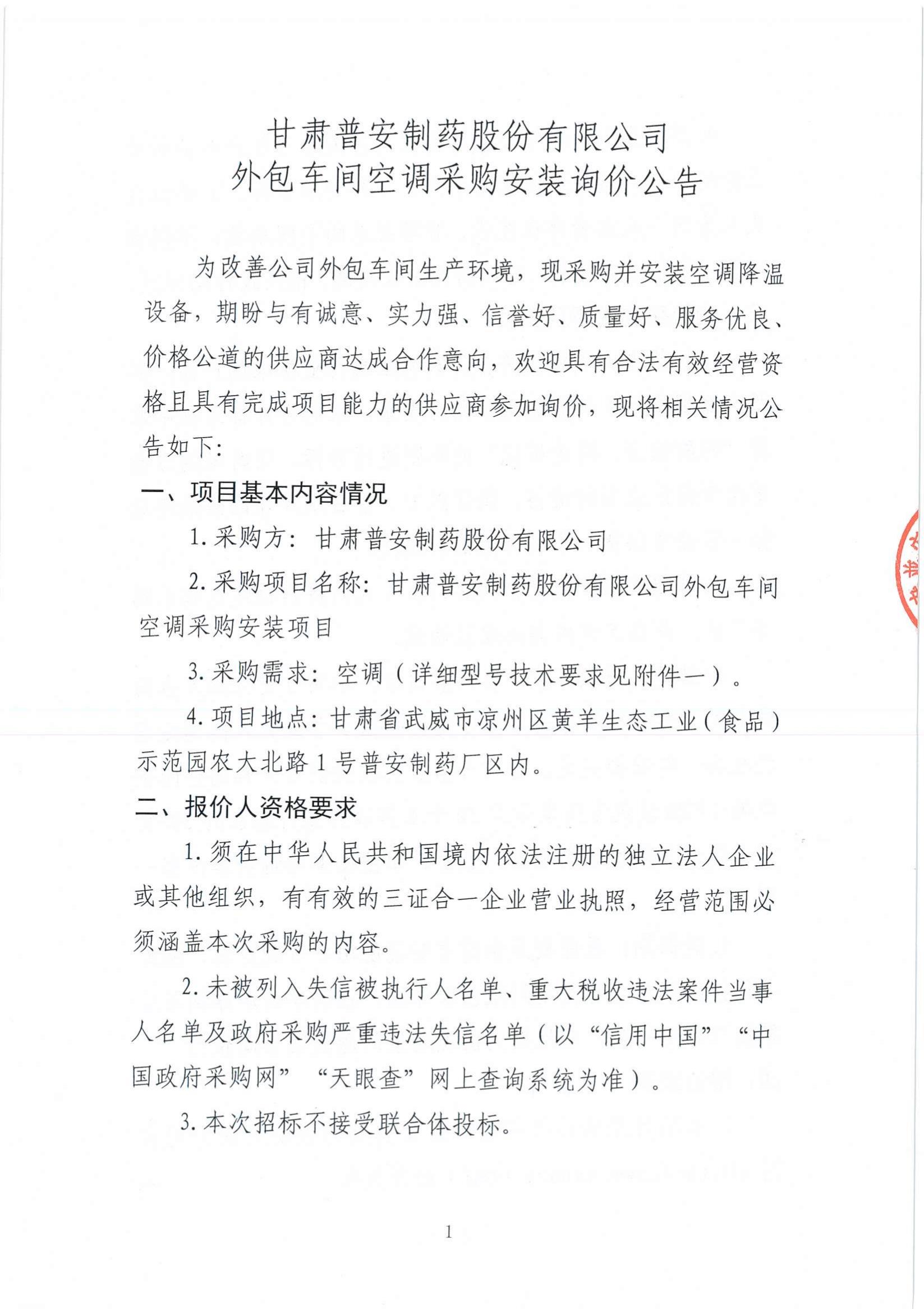 甘肅普安制藥股份有限公司外包車(chē)間空調(diào)采購(gòu)安裝詢(xún)價(jià)公告