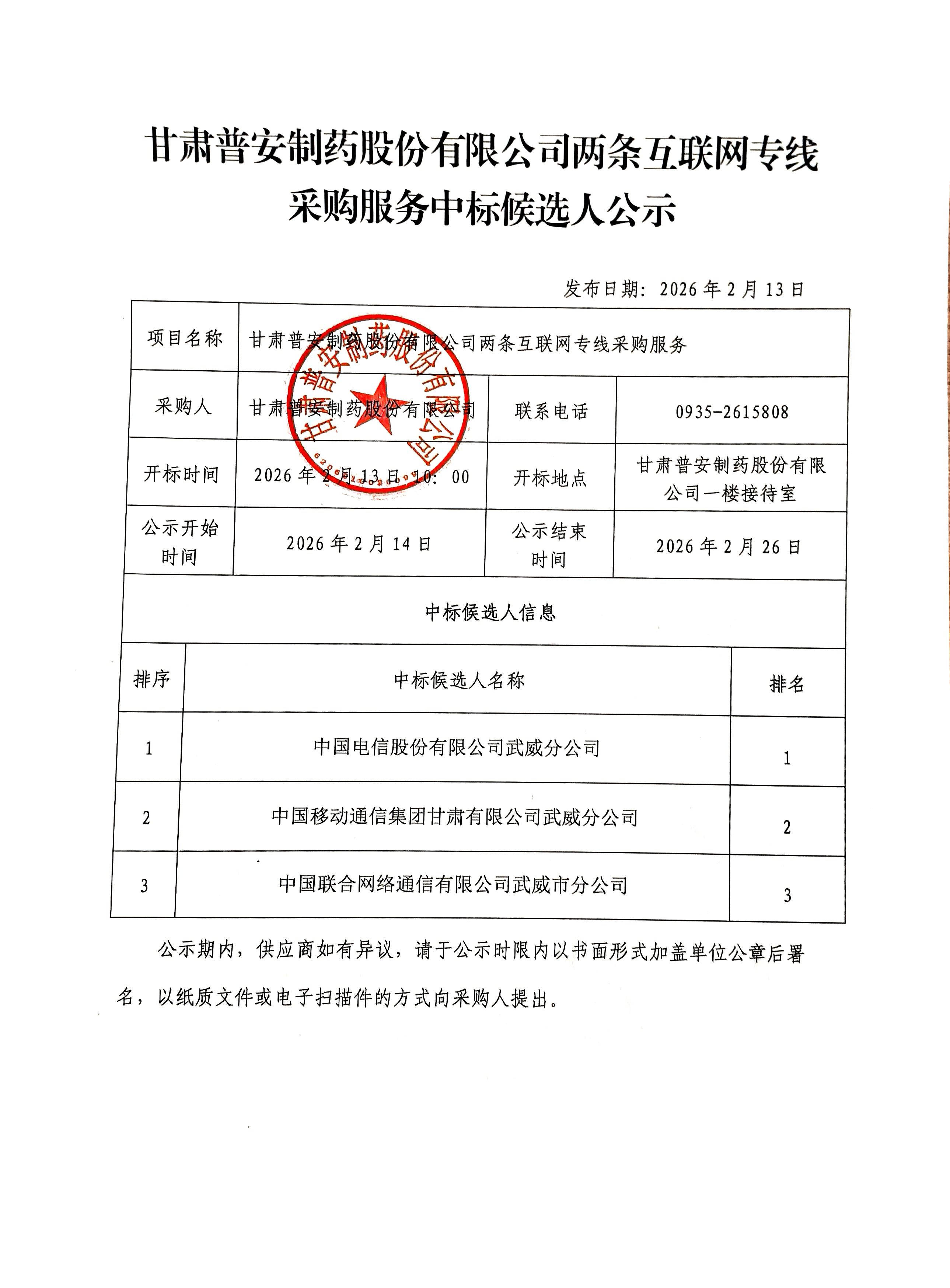 甘肅普安制藥股份有限公司兩條互聯網專線采購服務中標候選人公示
